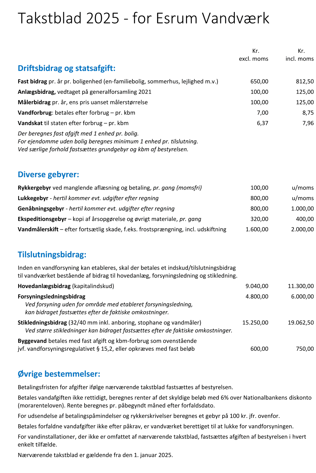 Priser - Takstblad 2025